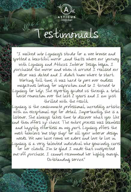 “I walked into Lynsay’s studio for a wee browse and spotted a beautiful mirror …and that’s where our journey with Lynsay and Atticus Interior Design began. I purchased the mirror and when it arrived I realised our décor was dated and I didn’t know where to start. Working full time, it was hard to pore over endless magazines looking for inspiration and so I turned to Lynsay for help. She expertly guided us through a total house renovation over the last 2 years and I am just thrilled with the result.Lynsay is the consummate professional, incredibly artistic with an exceptional eye for detail. Importantly, she is a listener. She always takes time to discover what you like and then offers up choice. The entire process was seamless and happily effortless on my part. Lynsay offers the most fabulous ’one stop shop’ for all your interior design needs. We now have rooms we adore and love to live in. Lynsay is a very talented individual who genuinely cares for her clients. I’m so glad I made that unexpected one-off purchase. I cannot recommend her highly enough. Outstanding service.”