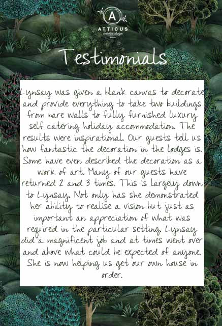 Lynsay was given a blank canvas to decorate and provide everything to take two buildings from bare walls to fully furnished luxury self catering holiday accommodation. The results were inspirational. Our guests tell us how fantastic the decoration in the lodges is. Some have even described the decoration as a work of art. Many of our guests have returned 2 and 3 times. This is largely down to Lynsay. Not only has she demonstrated her ability to realise a vision but just as important an appreciation of what was required in the particular setting. Lynsay did a magnificent job and at times went over and above what could be expected of anyone. She is now helping us get our own house in order.