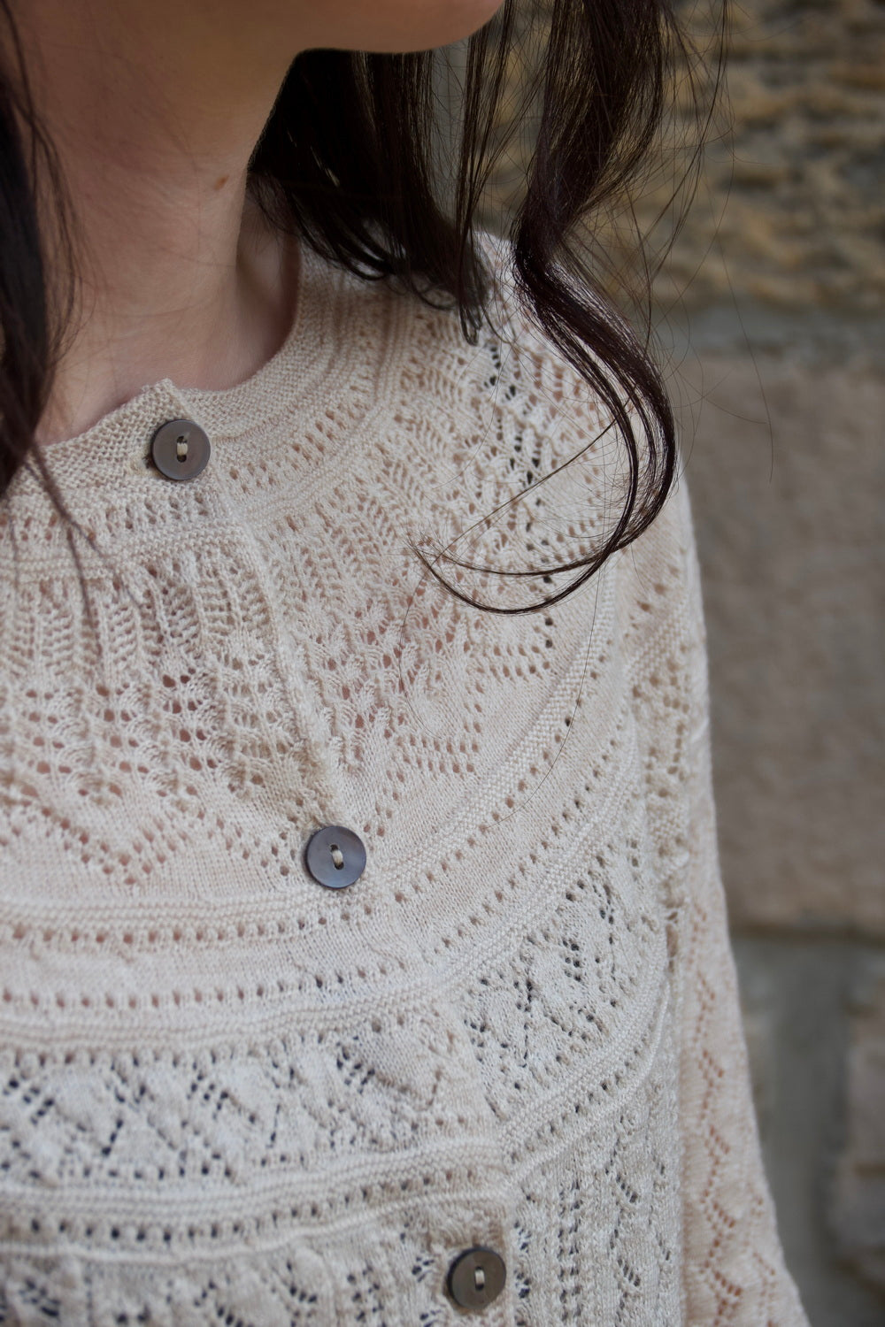 Intricate lace-effect knitting and finished with contrasting buttons, this cardigan looks beautiful with a dress or jeans,.