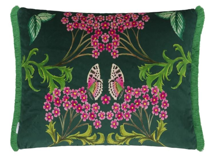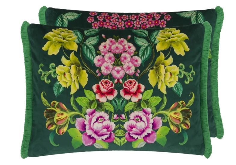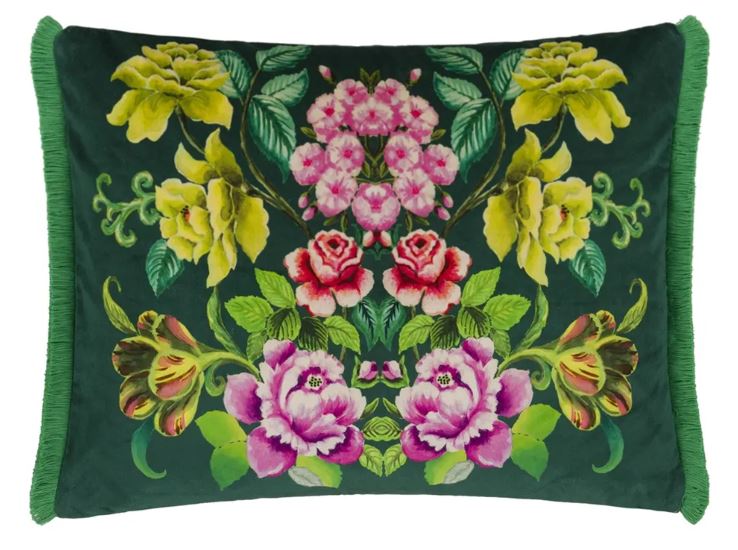 Elegant painterly studies of trailing spring flowers and foliage are set in a mirrored damask form in this stunning large rectangular floral cushion in rich viridian green. Digitally printed onto luxurious velvet and finished with a brush fringed trim on two sides.