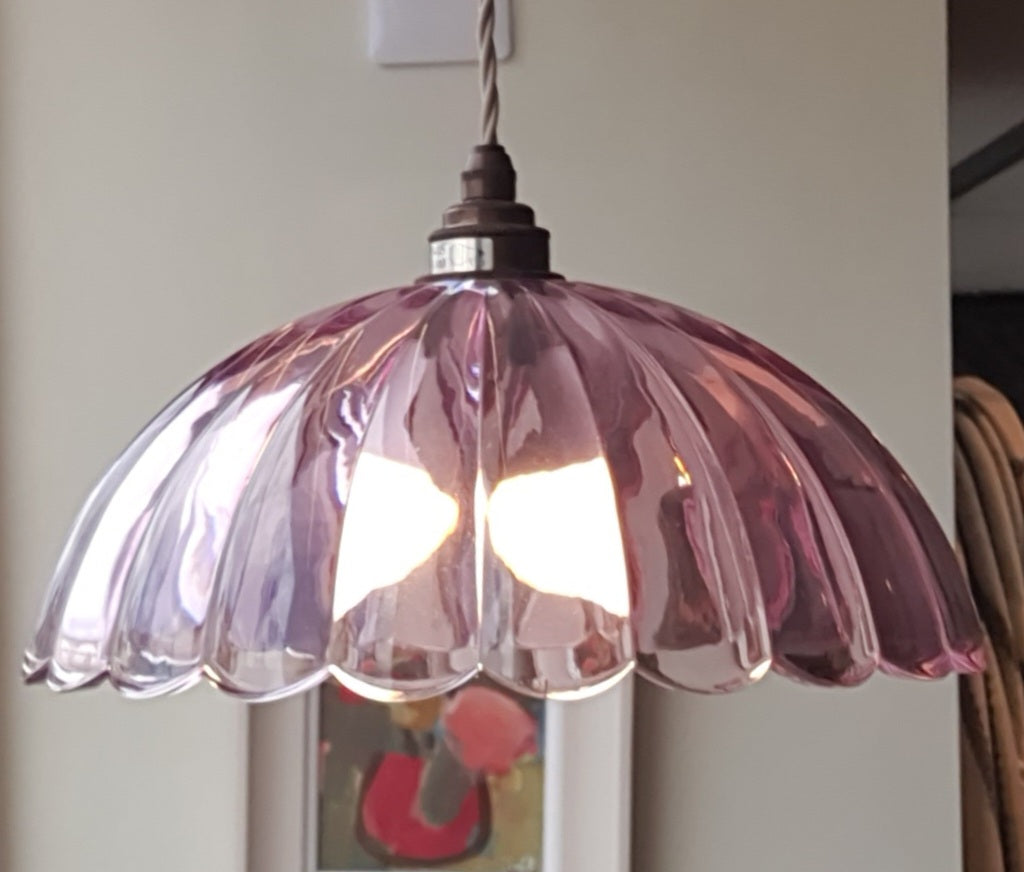 This gorgeous glass lamp shade features a piece of stunning moulded glass in four colour ways at its core. This glass is large, forming an attractive dome with scalloped edge and petal-like formations. It also features SOLID BRASS hardware and an OATMEAL braided cable. Shown in ROSE.