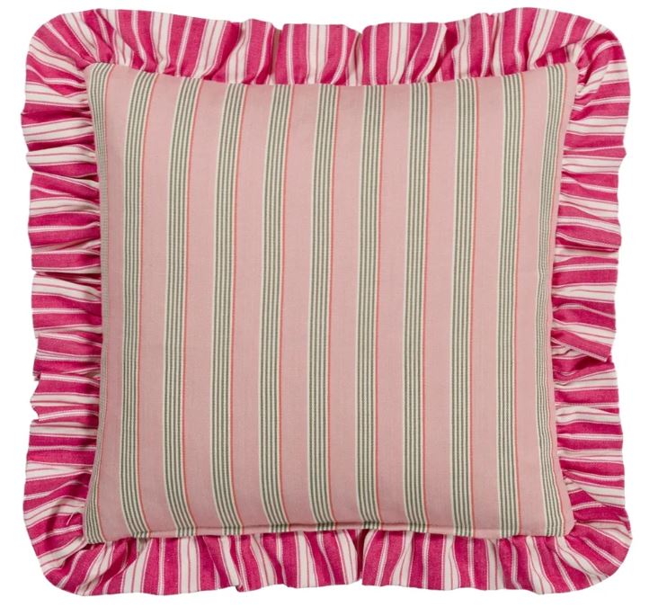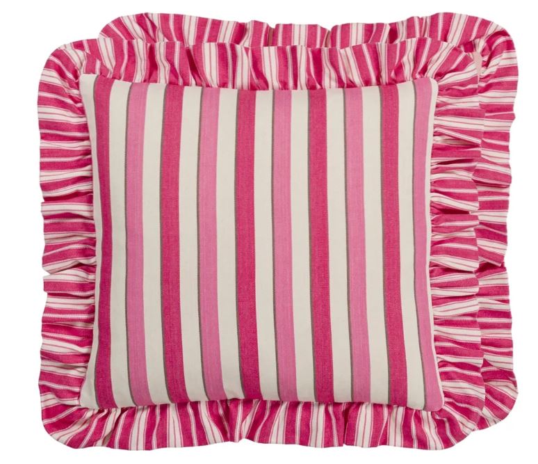 This joyful striped woven cotton cushion features a maximalist ruffled trim on all fours sides. Featuring three scales of graphic stripes in vibrant shades of fuchsia pink in a medium square size. The perfect addition to your interior scheme.
