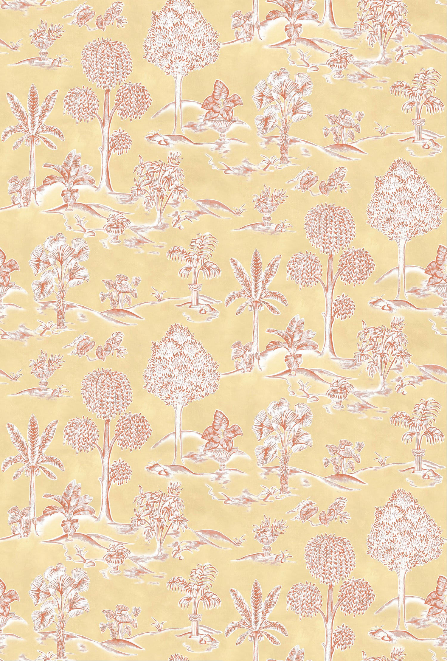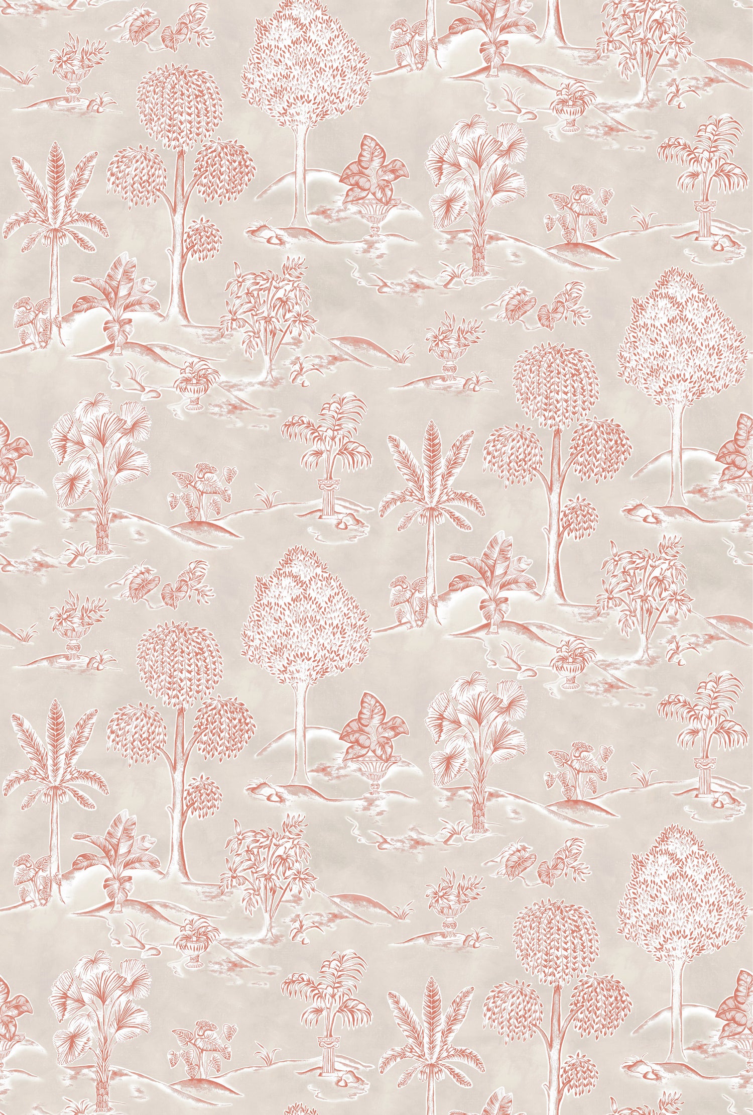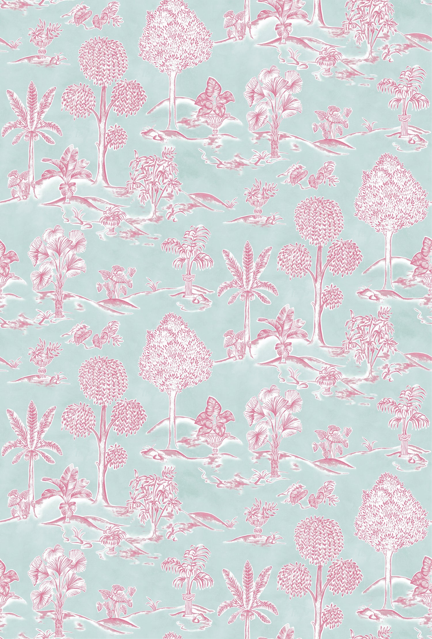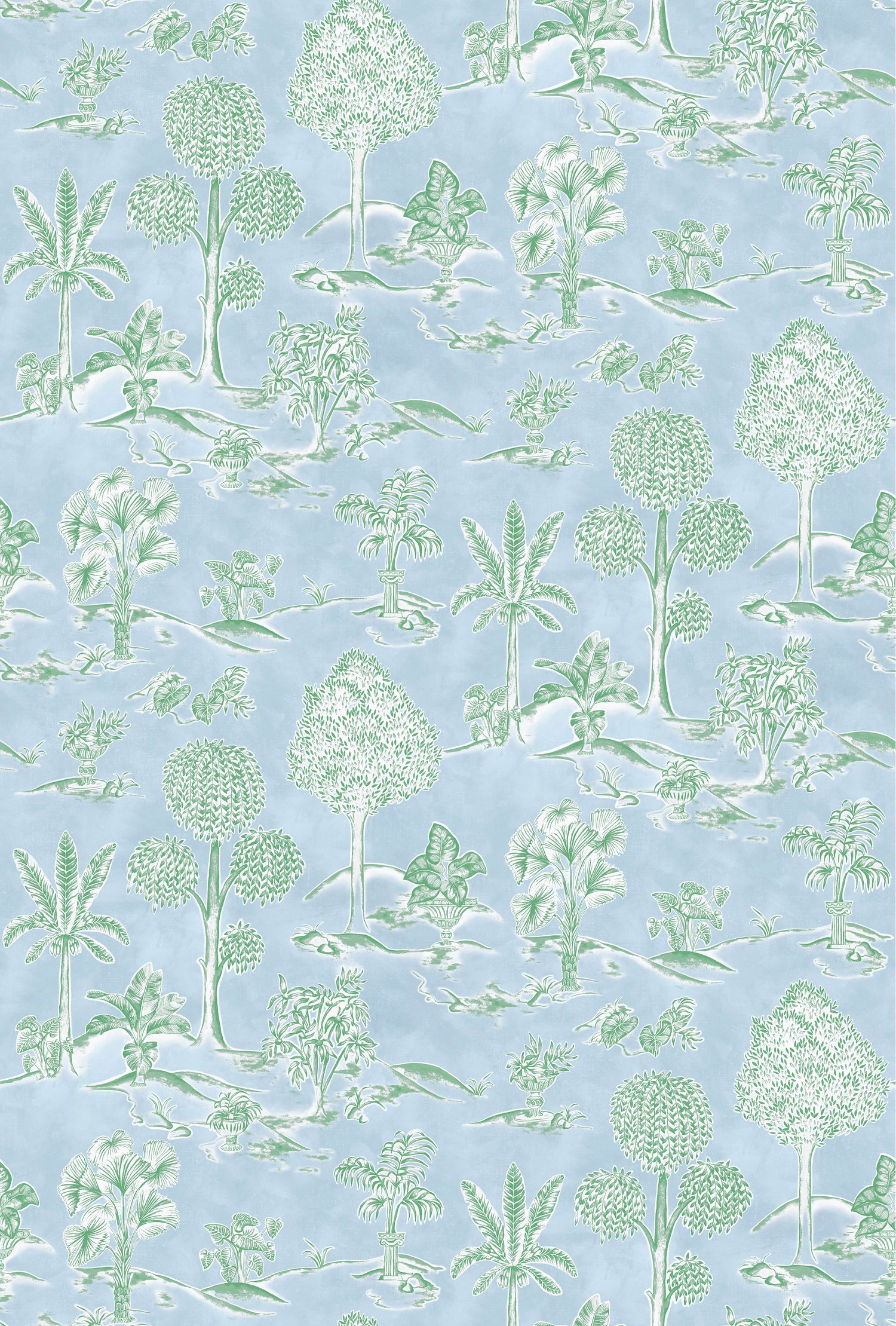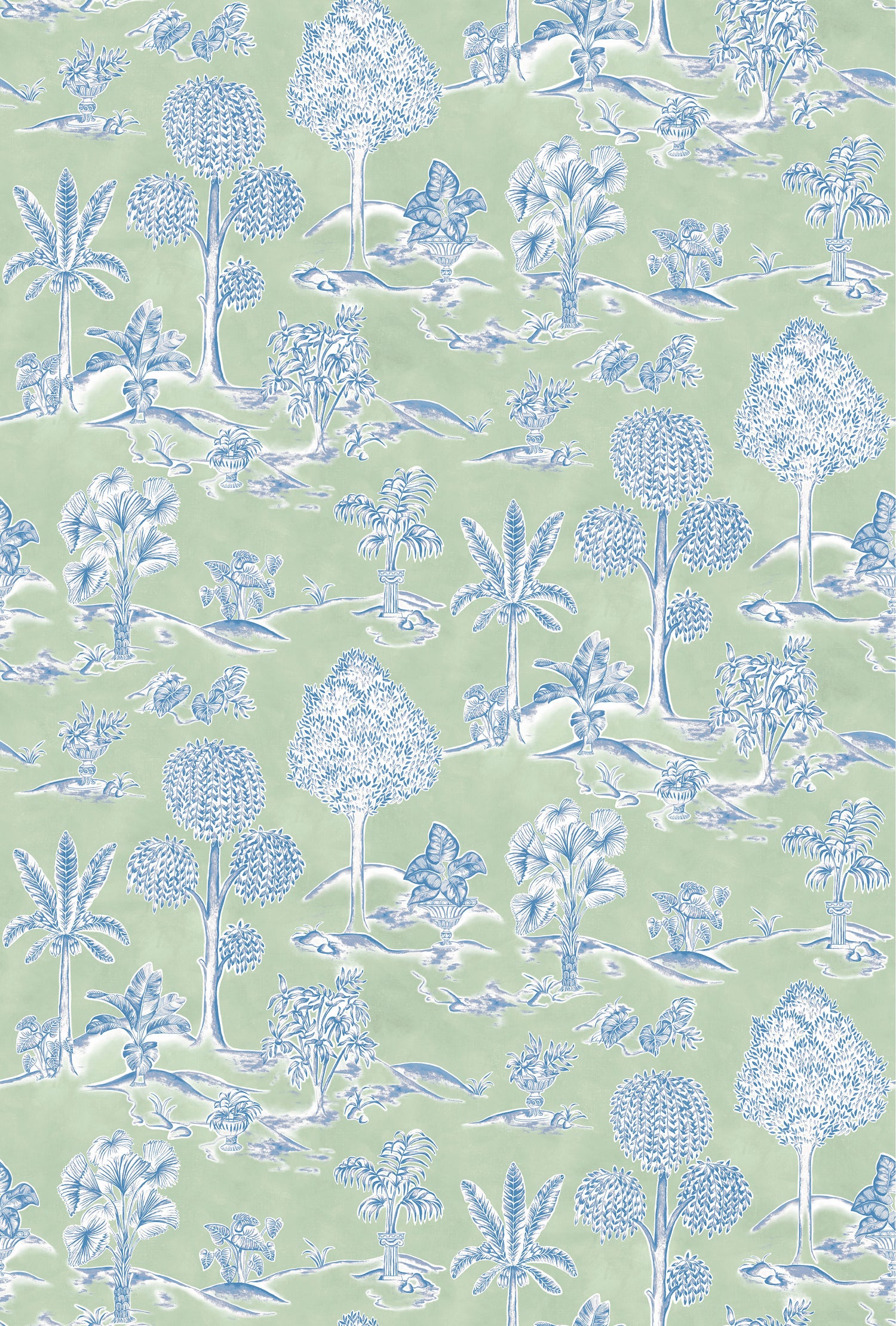 Reimagines a classic toile with influences from Greek ornamental gardens, where decorative columns and sculpted urns sit amidst lush foliage.
